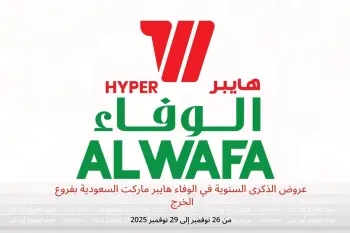 الوفاء هايبر ماركت السعودية بفروع الخرج تعلن عن تخفيضات جديدة بعنوان « عروض الذكرى السنوية » المتوفرة حتي يوم 29 نوفمبر 2025, عروض جديدة وأسعار فقط في السعودية.