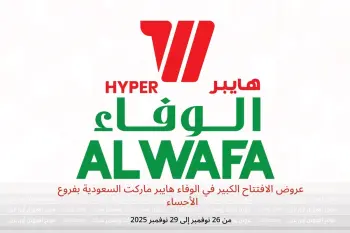 الوفاء هايبر ماركت السعودية بفروع الأحساء تعلن عن تخفيضات جديدة بعنوان « عروض الافتتاح الكبير » المتوفرة حتي يوم 29 نوفمبر 2025, عروض جديدة وأسعار فقط في السعودية.