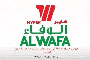 الوفاء هايبر ماركت السعودية بفروع الأحساء تعلن عن تخفيضات جديدة بعنوان « عروض الشراء بالجملة » المتوفرة حتي يوم 9 ديسمبر 2025, عروض جديدة وأسعار فقط في السعودية.