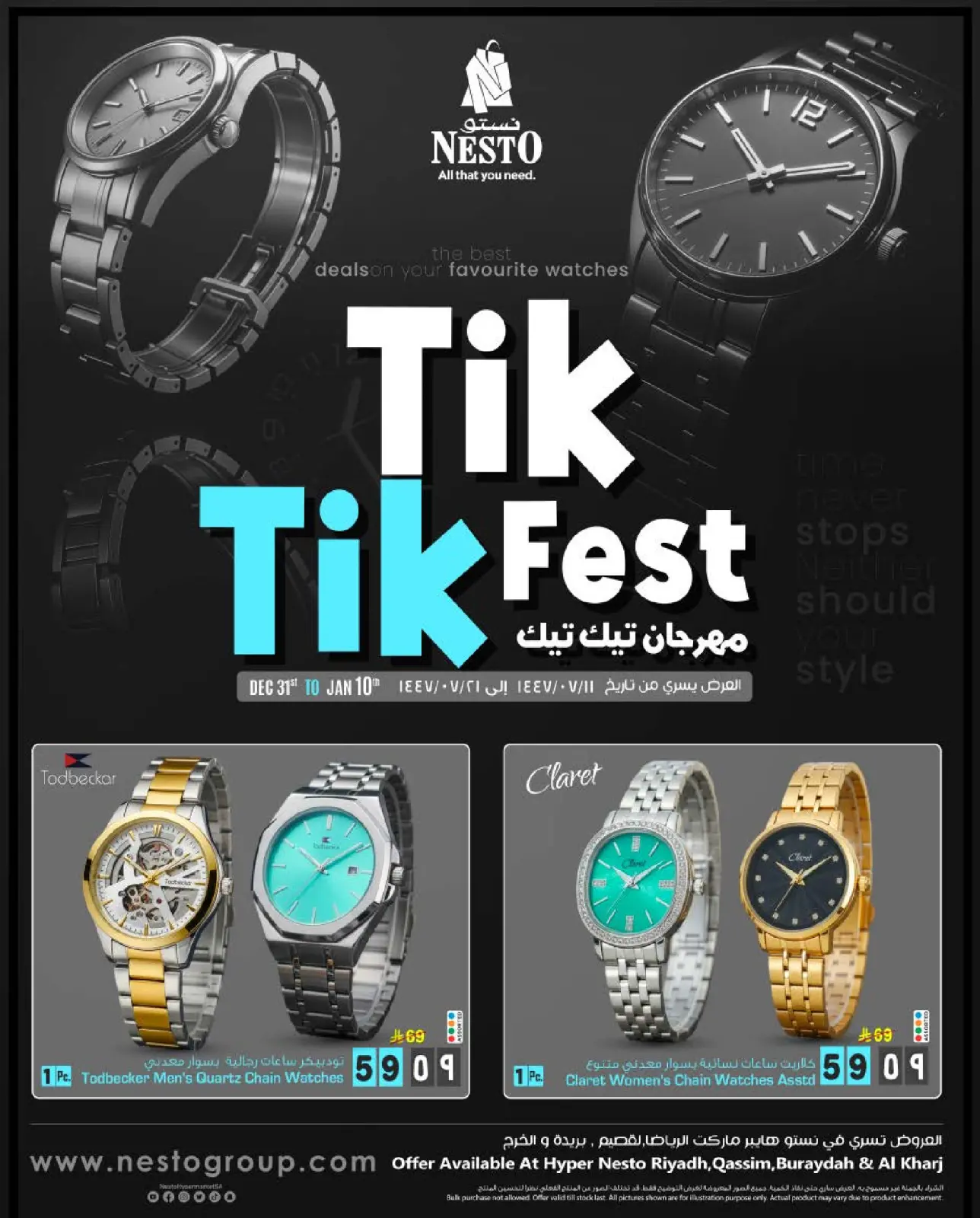 تنويه: صور وأسعار عروض نستو السعودية بفروع الرياض القصيم و الخرج مهرجان تيك تيك المعروضة في هذا الكاتالوج لأغراض توضيحية فقط، وتخضع للتوفر في الفروع خلال فترة العرض.