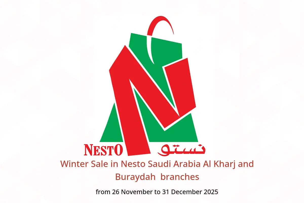 Nesto Saudi Arabia in Al Kharj and Buraydah branches announces new discounts titled « Winter Sale » available until 31 December 2025, new offers and prices only in Saudi Arabia.