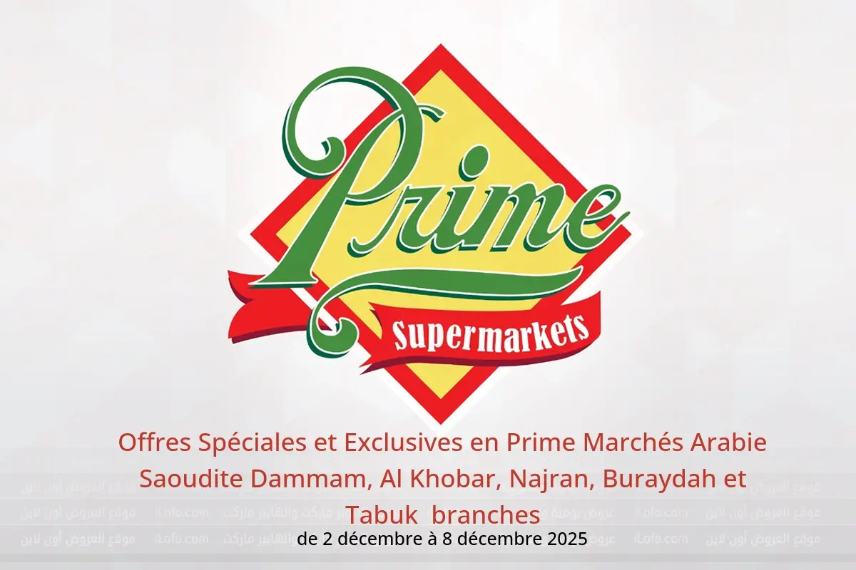 Prime Marchés Arabie Saoudite dans les branches Tabuk, Najran, Buraydah, Al Khobar et Dammam annonce de nouvelles réductions intitulées « Offres Spéciales et Exclusives » disponibles jusqu'au 8 décembre 2025, de nouvelles offres et prix uniquement en Arabie Saoudite.